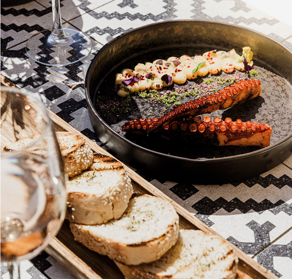 Crisp Greek Salad, Quinoa Salad with grilled shrimp and Homemade Lemonade with Strawberries provide a light, vibrant contrast, while Grilled Octopus paired with silky fava and a chilled Assyrtiko from Santorini showcases the best of island flavors.